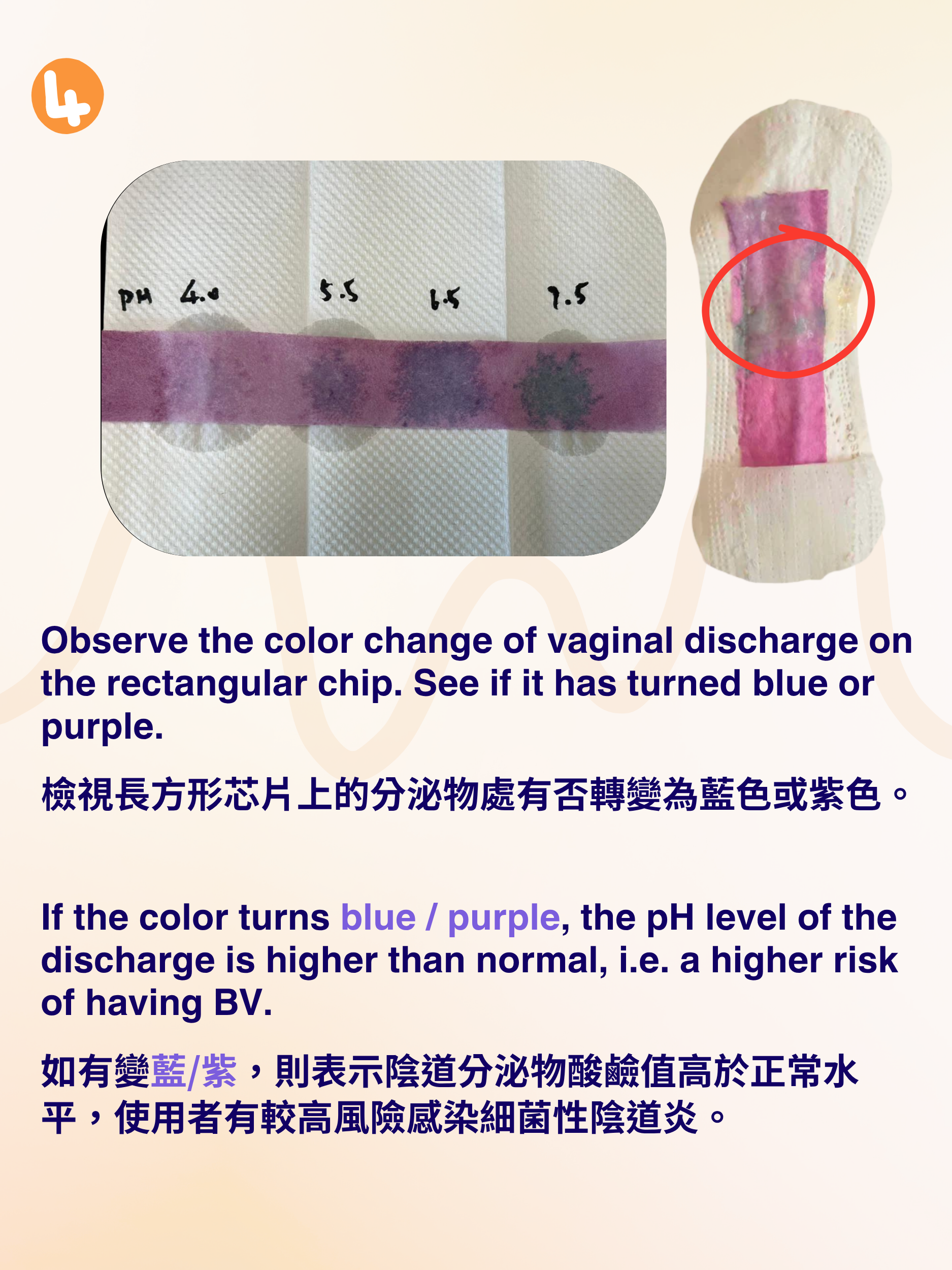 健康陰道分泌物酸鹼值介乎3.8至4.5,當其酸鹼值高於4.5,有機會患上細菌性陰道炎。本產品的指示芯片由粉紅轉為紫色/藍色時(pH>4.5),顯示有風險患上細菌性陰道炎。